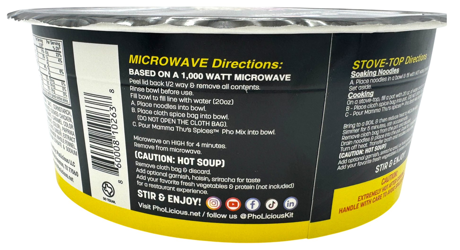 PhoLicious is a delicious, authentic, and traditional instant Vietnamese noodle soup. Your journey begins with our unique recipe of rice noodles, steamed and dried to perfection. The magic lies in combining our proprietary bouillon, crafted from real beef & chicken, with a special blend of aromatic whole spices in a tea bag form,  then tying it all together with spices inspired by Mamma Thu's cherished family recipe.  Experience Pho soup perfection like never before. Each spoonful delivers an indescribable flavor that truly captures the essence of authenticity. 🍜✨PhoLicious is a great ramen alternative!