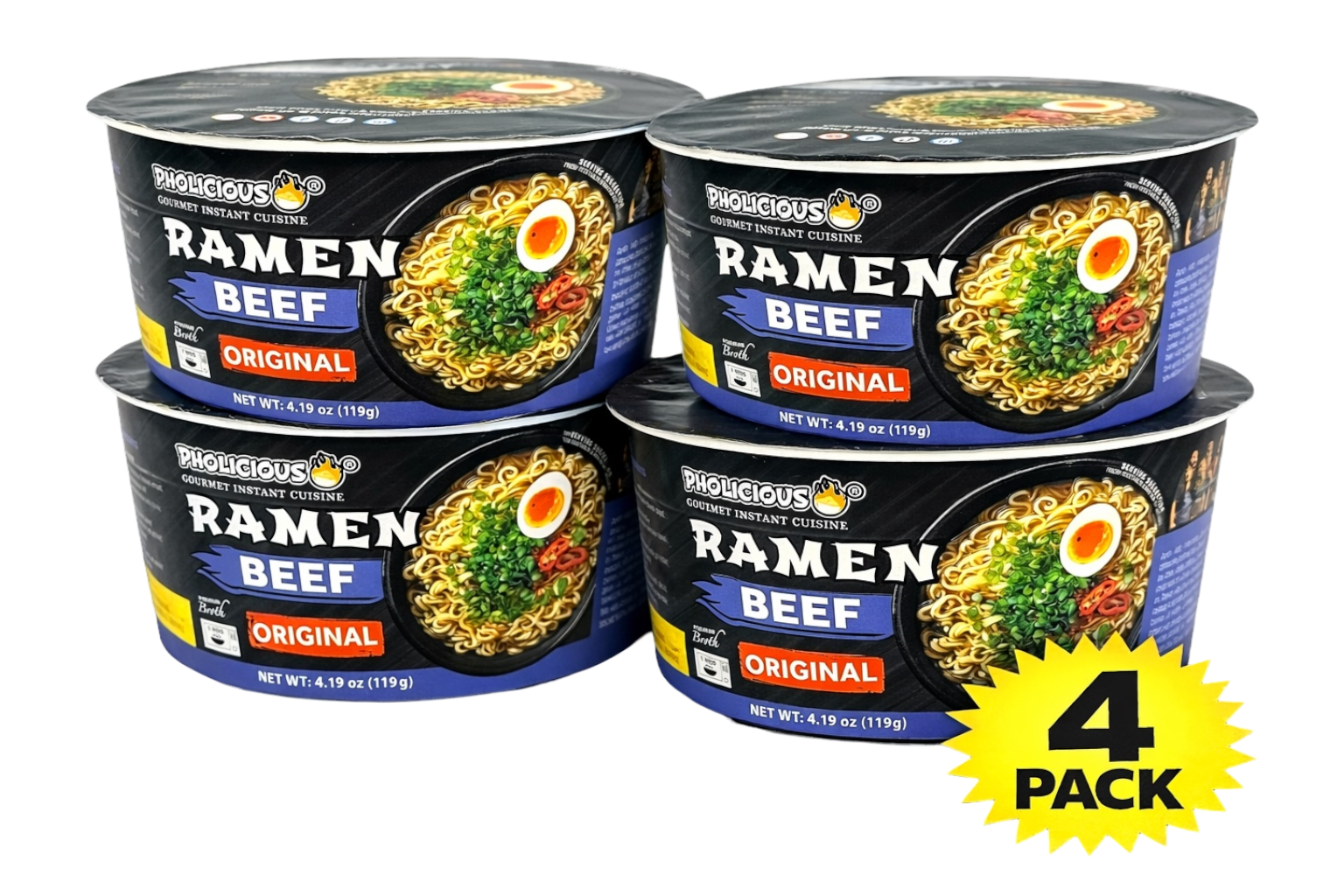 PREMIUM RAMEN: ORIGINAL BEEF, Instant, PhoLicious Brand, 4 Pack / 4.19 Ounce Bowls, Fresh Ingredients