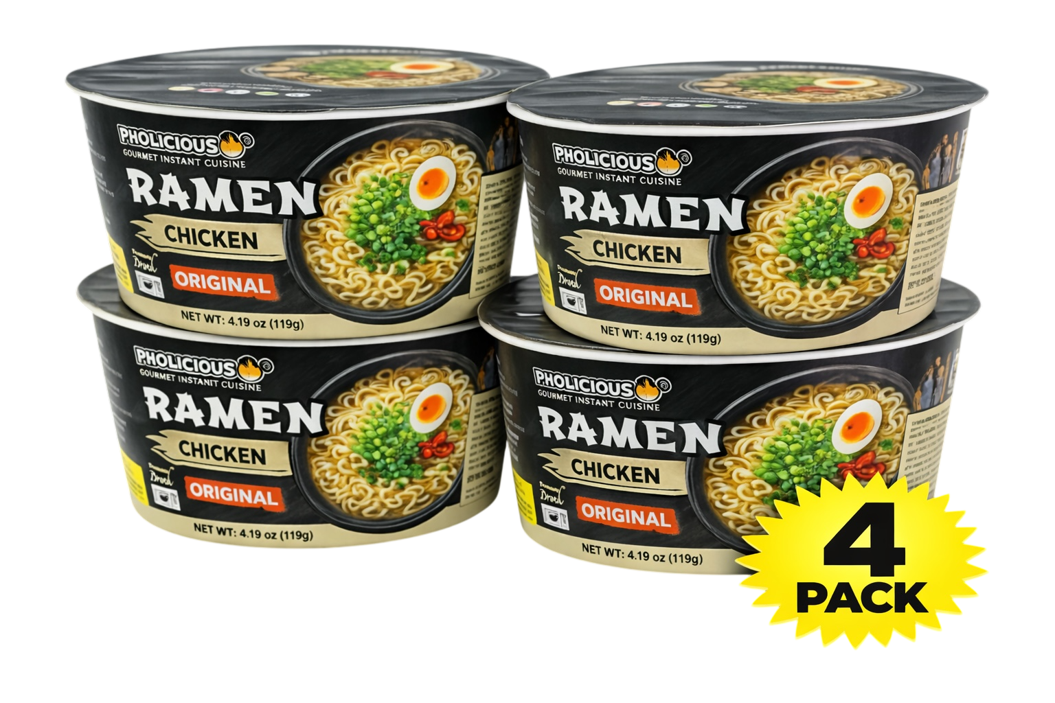 PREMIUM RAMEN: ORIGINAL Chicken, Instant, PhoLicious Brand, 4 Pack / 4.19 Ounce Bowls, Fresh Ingredients